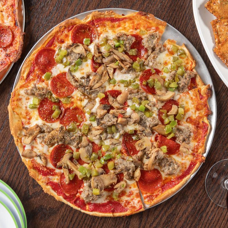 Everything But Anchovies. Premium cheese, pepperoni, sausage, mushroom, and green peppers.